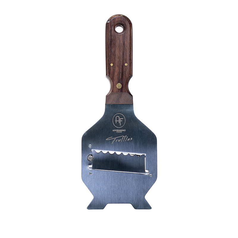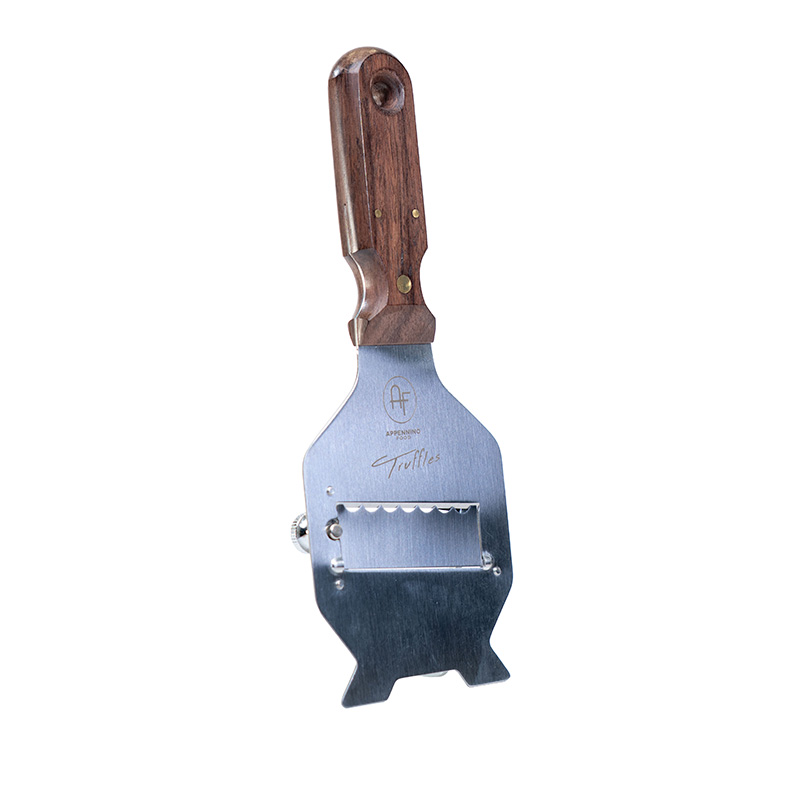 Ideal para lograr láminas de Trufa de cualquier grosor. Añaden el factor sorpresa cuando se utilizan a la mesa frente a todos. Hecho a mano, la hoja de acero inoxidable cuenta con ajuste de precisión para lograr el grosor deseado. La madera del mango cambia según la estación y disponibilidad.